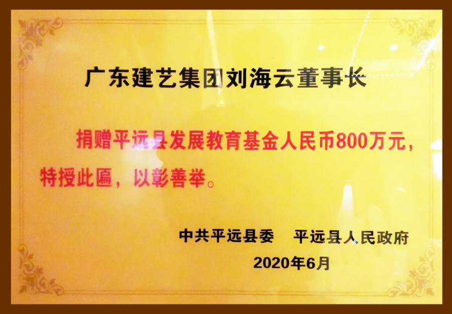 2013年,劉海云董事長為廣東省梅州市捐資20萬元,用于解決當?shù)匾驗氖軞У幕A設施重建工作;2015年,劉海云董事長為梅州市扶貧救助公益活動捐資20萬元,資助當?shù)氐睦щy群眾,并改善當?shù)亟虒W條件;2016年,在廣東省興寧商會成立慶典大會——百余名書畫名家捐贈作品義賣活動中,劉海云董事長認購書畫作品20萬元,用于資助興寧市貧困學生;2017年,作為政協(xié)廣東省梅州市七屆常委,劉海云董事長代表梅州市“政協(xié)委員愛心之家”為當?shù)乩щy群眾送愛心,將愛心款5000元交到《梅州日報》記者手上,并委托《梅州日報》欄目組轉交給身患尿毒癥的豐順縣湯西鎮(zhèn)大羅村村民黃文強手中,表達了市政協(xié)和委員的關愛;作為政協(xié)常委,劉海云董事長還積極捐資20多萬元,為青華村1.5公里主村道安裝LED路燈,極大地方便了當?shù)卮迕竦囊归g出行,也為當?shù)卮迕窀熳呱现赂宦纷龀隽素暙I;2019年,在2019年度“廣東扶貧濟困日”活動中,劉海云董事長再次伸出援手,向平遠縣仁居鎮(zhèn)捐贈善款100萬元,用于支持當?shù)氐缆窐蛄航ㄔO;2020年,新冠肺炎疫情席卷廣東,劉海云董事長第一時間指示相關人員向平遠縣紅十字會援助1萬只口罩,同時分別向梅州市政協(xié)及興寧市人民政府捐款20萬元及10萬元,以解廣東梅州、興寧、平遠等地疫情防控當務之急;同年,在平遠縣發(fā)展教育基金會成立暨捐贈儀式上,劉海云董事長向基金會慷慨捐贈800萬元善款,助力廣東平遠當?shù)刎毨W子完成學業(yè)、教育系統(tǒng)貧困教職工擺脫生活困苦狀況,并促進平遠教育事業(yè)全面發(fā)展。