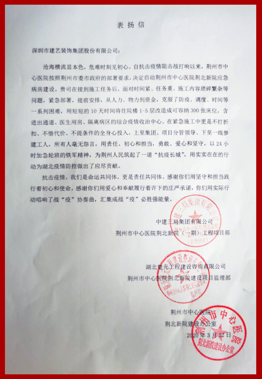 鑒于建藝團(tuán)隊在疫情防控關(guān)鍵期為荊州疫情防控大局所做的突出貢獻(xiàn),日前,中建三局集團(tuán)有限公司(荊州市中心醫(yī)院荊北新院(一期)工程項目部)、湖北楚元工程建設(shè)咨詢有限公司(荊州市中心醫(yī)院荊北新院建設(shè)項目監(jiān)理部)、荊州市中心醫(yī)院(荊北新院建設(shè)辦公室)三方聯(lián)合發(fā)布表揚(yáng)信,對集團(tuán)、施工分管領(lǐng)導(dǎo)、一線參建工人通報表揚(yáng)。感謝建藝集團(tuán)上下以忘我付出的“鐵軍”精神,憑實實在在的行動,以強(qiáng)大的社會責(zé)任心與使命感,用雙手為荊州人民筑起了一道“抗疫長城”,有效助力了荊州乃至湖北的疫情防控工作。