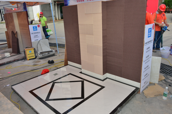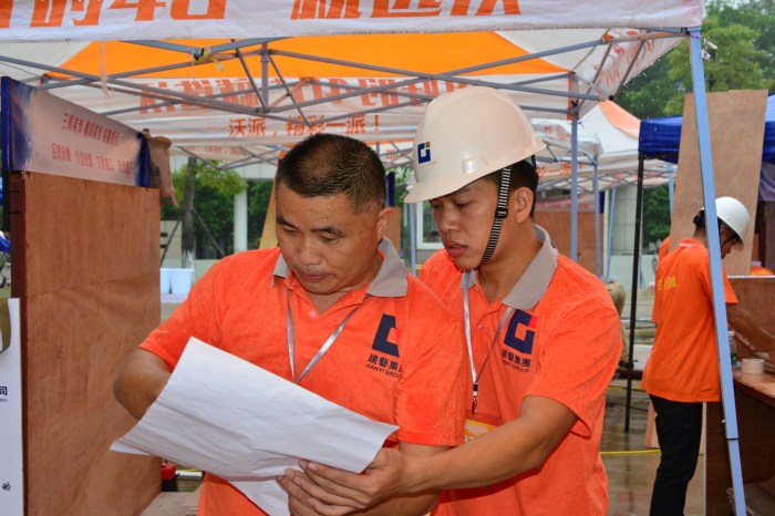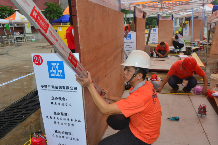 下午2:30,工人們稍事休息后重新投入比賽,繼續(xù)上午未完成的工作。最后,建藝團隊以超高的效率率先完成一道考題,此時,大部分選手都還在施工進行中。