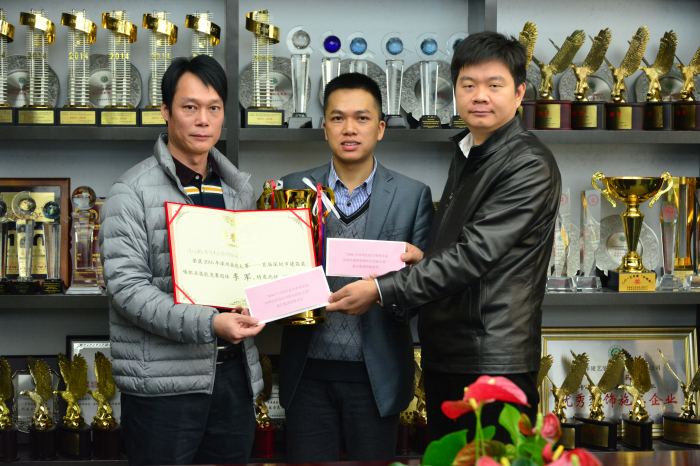 建藝集團副總裁趙紂瑜(右一)代表集團向陳計明(左一)及郭勇剛(左二)頒發(fā)獎金以示鼓勵