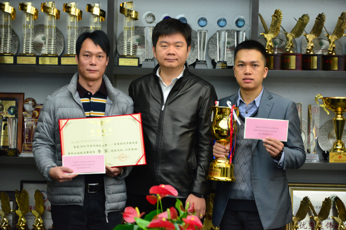 鑒于工程管理中心陳計明、郭勇剛等人在11月深裝協(xié)舉辦的“2016年深圳技能大賽暨首屆深圳市建筑裝飾職業(yè)技能競賽”決賽中憑借一流的表現(xiàn)與優(yōu)秀的團隊配合,斬獲“團體季軍”及“個人三等獎(鑲貼工項目)”,為集團贏得了榮譽,用成績詮釋了建藝人精湛的工匠技藝與嚴謹務(wù)實工作作風(fēng)。1月16日,建藝集團副總裁趙紂瑜代表集團,向陳計明、郭勇剛二人頒發(fā)獎金,以示鼓勵。
