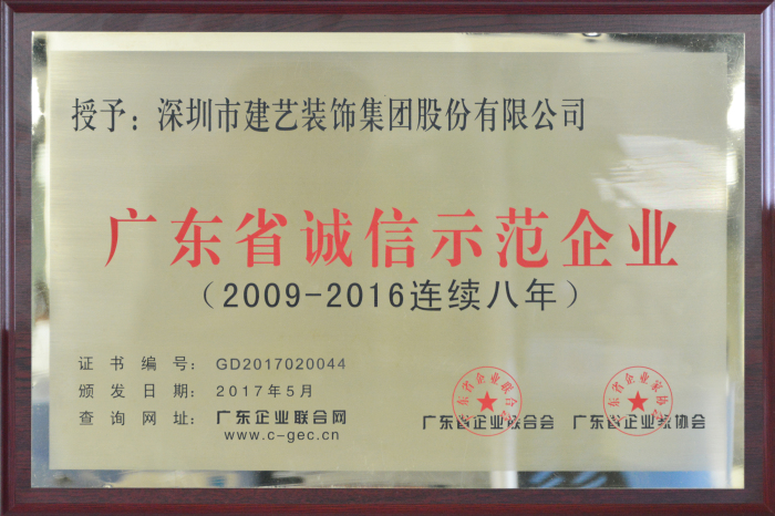 作為中國建筑裝飾行業(yè)百強企業(yè)前十名企業(yè),建藝集團歷來注重品牌與誠信建設。多年來,以專業(yè)管理、誠信經營、品牌塑造為主旨,建藝人在建筑裝飾領域銳意進取、勇攀新高,用實實在在的誠信經營口碑及強大的品牌影響力,為社會貢獻了一大批裝飾裝修工程精品,并盡自身能力不斷推動廣東社會經濟發(fā)展。5月10日,在廣東省企業(yè)聯(lián)合會/廣東省企業(yè)家協(xié)會主辦的“第23屆廣東省企業(yè)家活動日”大會上,建藝集團憑借出眾的誠信管理體系及卓越的行業(yè)發(fā)展表率,再次蟬聯(lián)“廣東省優(yōu)秀企業(yè)(2016年度)”及“廣東省誠信示范企業(yè)(2009-2016連續(xù)八年)”。