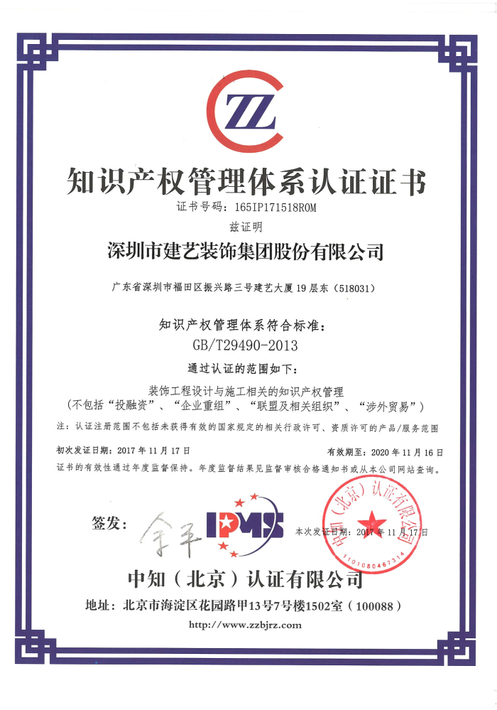 鑒于此,建藝集團于2016年年底著手知識產(chǎn)權(quán)管理體系引用與推行的準備工作,2017年3月開始在集團各管理職能部門貫徹實施,并于2017年11月17日通過中知(北京)認證有限公司首次認證。