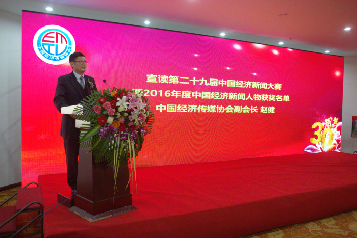 中國經(jīng)濟(jì)傳媒協(xié)會副會長趙健宣讀第二十九屆中國經(jīng)濟(jì)新聞大賽暨2016年度中國經(jīng)濟(jì)新聞人物獲獎名單
