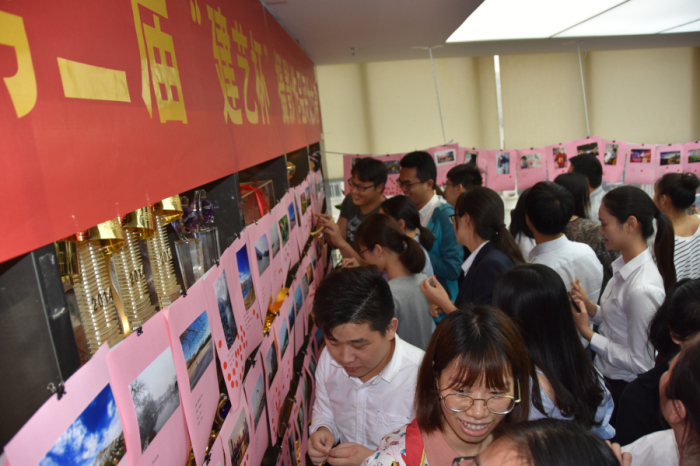 最終,經(jīng)過現(xiàn)場投票評比,決出了“手機組”和“單反組”的一等獎、二等獎、三等獎、優(yōu)秀獎作品,共計18幅。在頒獎儀式上,頒獎嘉賓——集團副總裁趙紂瑜再次對本次攝影大賽活動表示贊揚,他表示:集團給員工們提供了一個施展才藝的平臺,希望大家珍惜,期待今后看到更多有才藝的員工在建藝平臺展示自我。頒獎結(jié)束后,趙總還和獲獎員工合影留念。