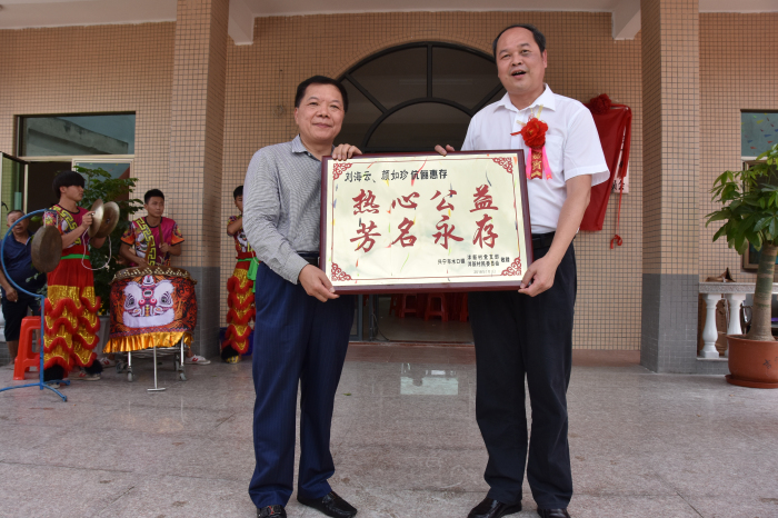 為表彰劉海云夫婦的大愛精神,廣東省梅州市政協(xié)副主席李忠良為他們頒發(fā)“熱心公益,芳名永存”牌匾。