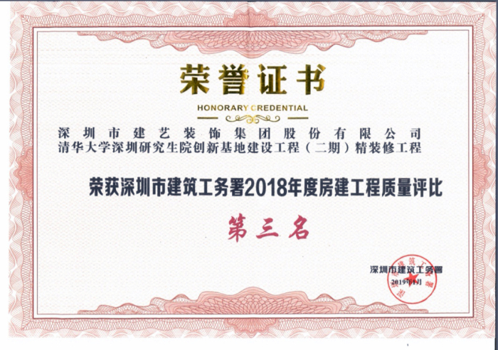 2018年度深圳市建筑工務(wù)署工程質(zhì)量評比第三名(建藝集團(tuán))