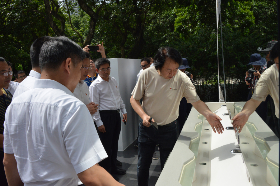 郭杰院長利用展示板向王國賓局長等領(lǐng)導(dǎo)介紹公園(西門)公共洗手間設(shè)計思路