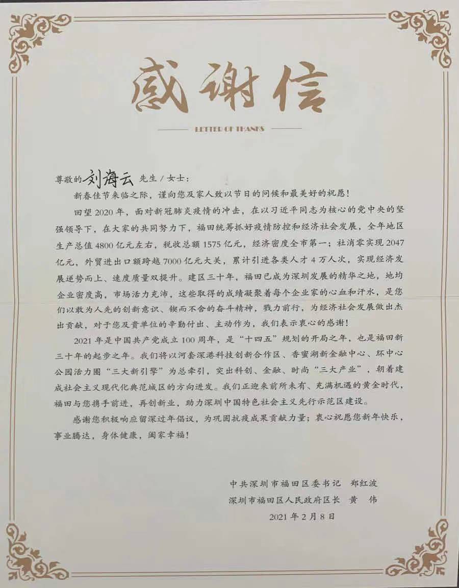 來自福田區(qū)委、區(qū)政府的感謝信