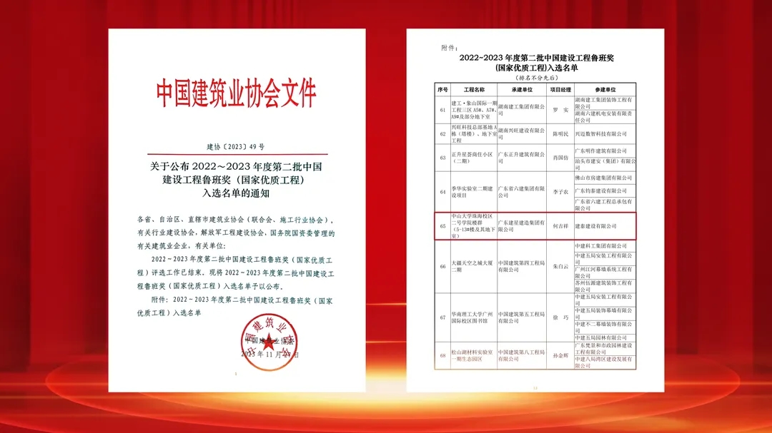 近日,中國建筑業(yè)協(xié)會公布了2022~2023年度第二批中國建設(shè)工程魯班獎(國家優(yōu)質(zhì)工程)入選名單,建藝集團(tuán)旗下子公司建星集團(tuán)承建項(xiàng)目中山大學(xué)珠海校區(qū)二號學(xué)院樓群,榮獲“中國建設(shè)工程魯班獎”,這是繼大氣科學(xué)學(xué)院樓后再次獲此殊榮,也是建星集團(tuán)榮獲的第3個(gè)魯班獎。