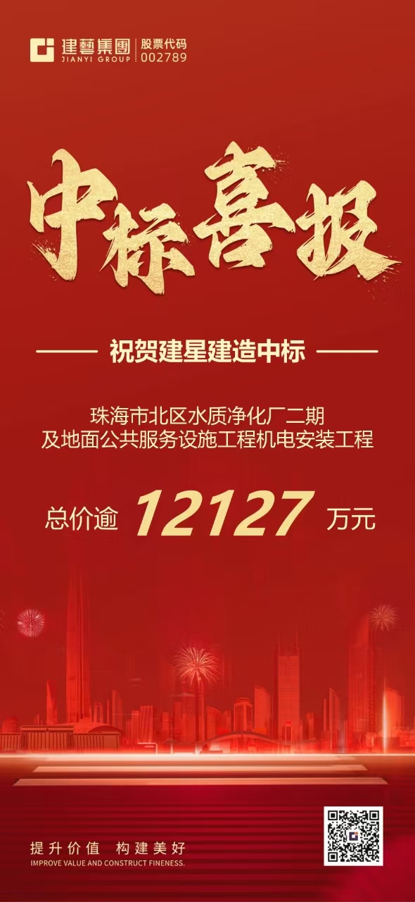 近日,深圳市建藝裝飾集團(tuán)股份有限公司旗下子公司廣東建星建造集團(tuán)有限公司(以下稱“建星集團(tuán)”)喜獲中標(biāo):珠海市北區(qū)水質(zhì)凈化廠二期及地面公共服務(wù)設(shè)施工程機(jī)電安裝工程,總價(jià)逾1.21億元。