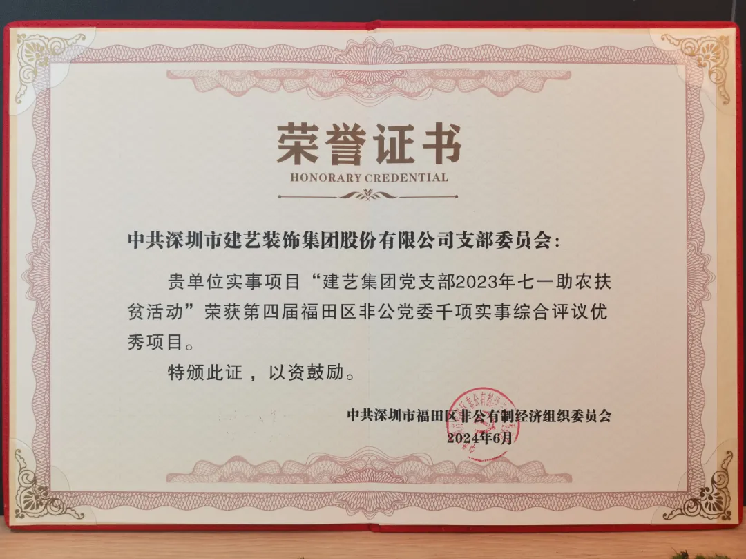 深圳市建藝裝飾集團股份有限公司黨支部(下稱建藝集團黨支部)受邀出席此次大會,憑借“2023年七一助農(nóng)扶貧活動”實事項目在數(shù)十家非公黨組織中脫穎而出,被評為第四屆福田區(qū)非公黨委“千項實事”綜合評議優(yōu)秀項目!