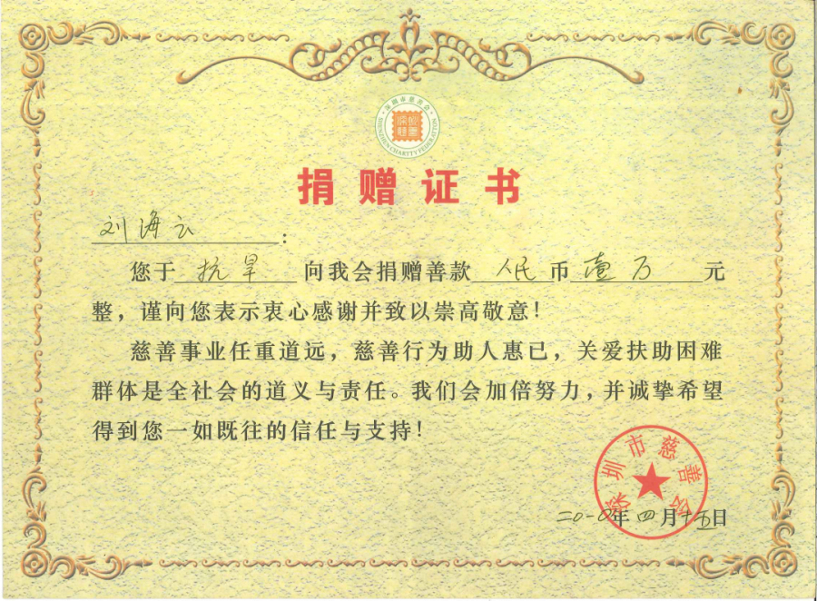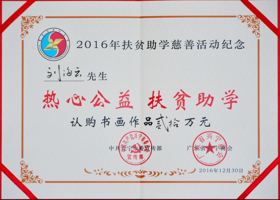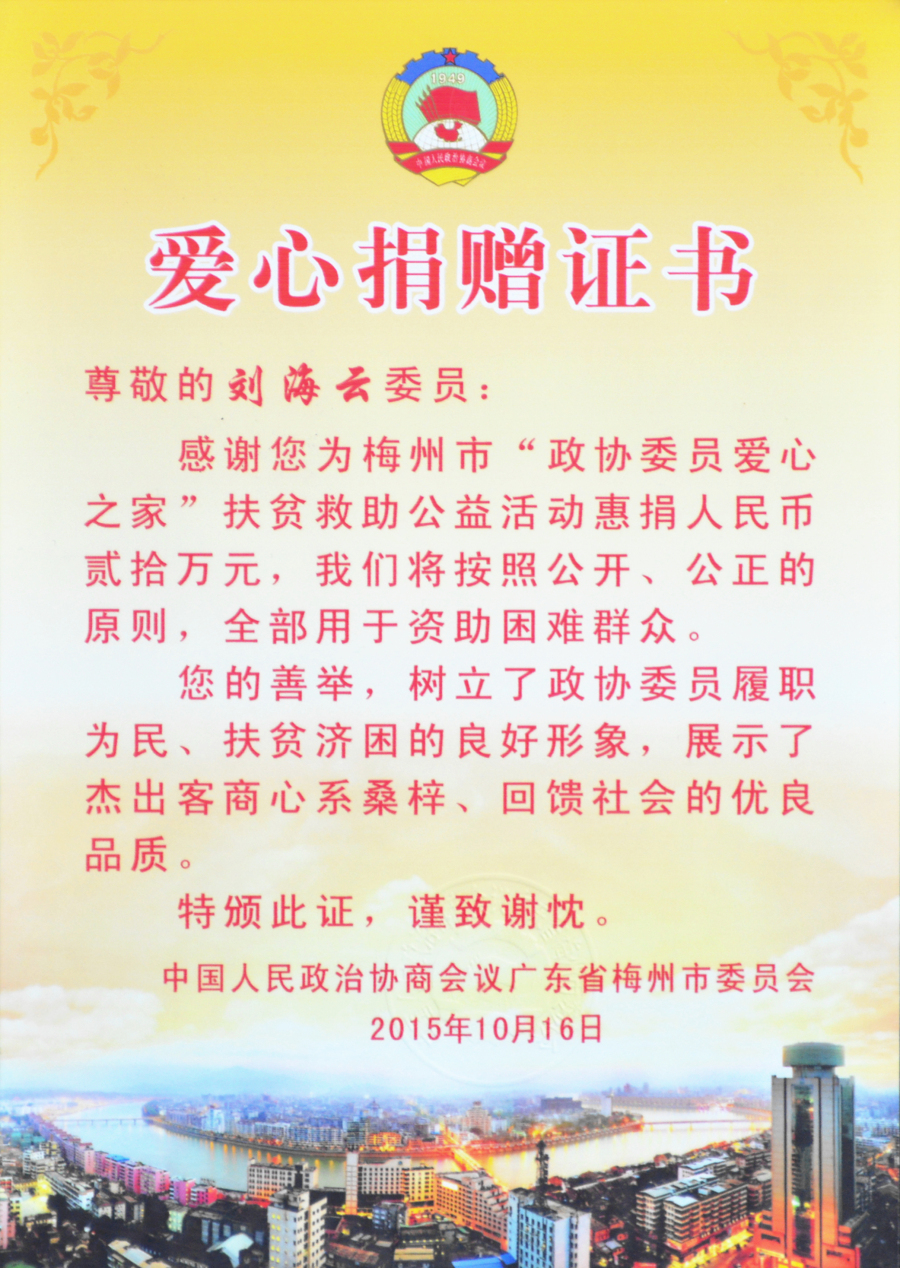 在2019年度“廣東扶貧濟困日”活動中,劉海云向平遠縣仁居鎮(zhèn)捐贈善款100萬元,用于支持當(dāng)?shù)氐缆窐蛄航ㄔO(shè);廣東興寧水口鎮(zhèn)洋新村老人活動中心新農(nóng)村建設(shè)共捐贈900多萬元;廣東平遠縣扶貧助學(xué)捐助270萬元;廣東興寧教育強市捐助200萬元;廣東興寧公益慈善共捐630萬元;廣東平遠縣發(fā)展教育基金會成立暨捐贈儀式上向基金會捐贈800萬元;廣東興寧市水口鎮(zhèn)2020年教育發(fā)展基金啟動中帶頭認捐1000萬元……