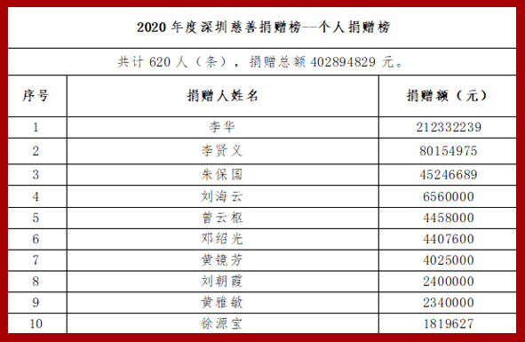 《深圳慈善捐贈(zèng)榜(個(gè)人捐贈(zèng)榜)》前10名
