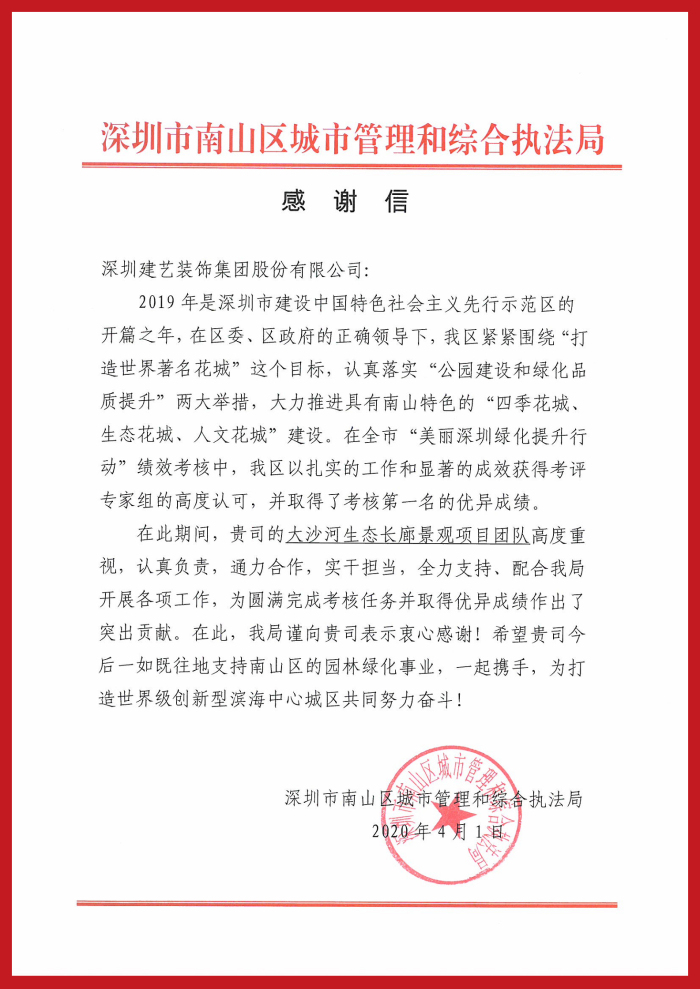 在得知深圳市開展“美麗深圳綠化提升行動”績效考核后,建藝集團大沙河生態(tài)長廊景觀項目團隊高度重視,并全力配合、協(xié)助南山區(qū)城市管理和綜合執(zhí)法局開展各項相關(guān)工作,最終助力區(qū)城管局圓滿完成考核任務并取得考核第一名的優(yōu)異成績。